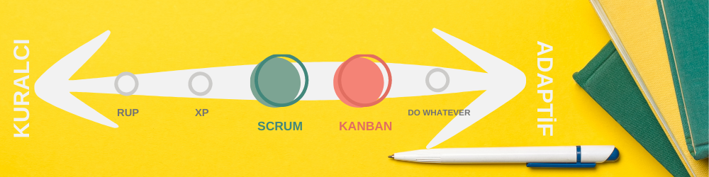Scrum ve Kanban’ı sol tarafı kuralcı, sağ tarafı adaptif bir eksene koymuş olsaydık, ikisi de oldukça adaptif tarafta olurdu. Fakat, ikisini karşılaştıracak olursak Scrum’ın, Kanban’a göre biraz daha fazla kurala sahip olduğunu söyleyebiliriz.